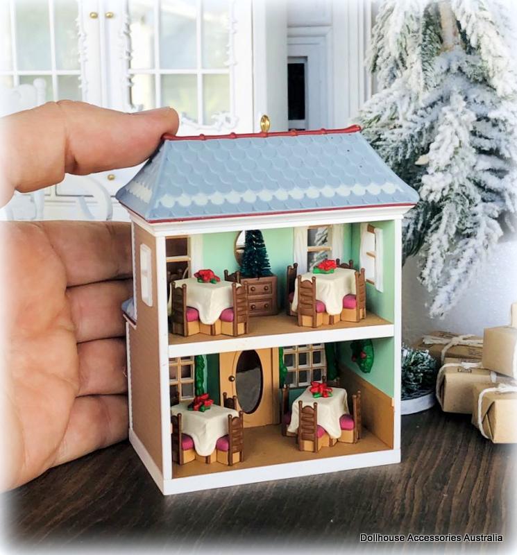 The Nostalgic Houses and Shop Hallmark Ornament series started with the 1984 Victorian Dollhouse. Every year a new shop or house would be released over the past 30 years. Many of these are highly collectible. The Nostalgia Houses and Shops series is one of the most popular Christmas collectibles, originally intended as a hanging ornament on a Christmas tree, as you'll see by the small hook on the top. But these adorable little houses and shops make the perfect miniature dollhouse or Christmas-themed village too. These ornaments can hang on your tree, or be displayed in your dollhouse nursery as a themed dollhouse within your miniature scene. They would be around 1:144 scale which makes them ideal as a "dollhouse" for a 1:12 scale scene.