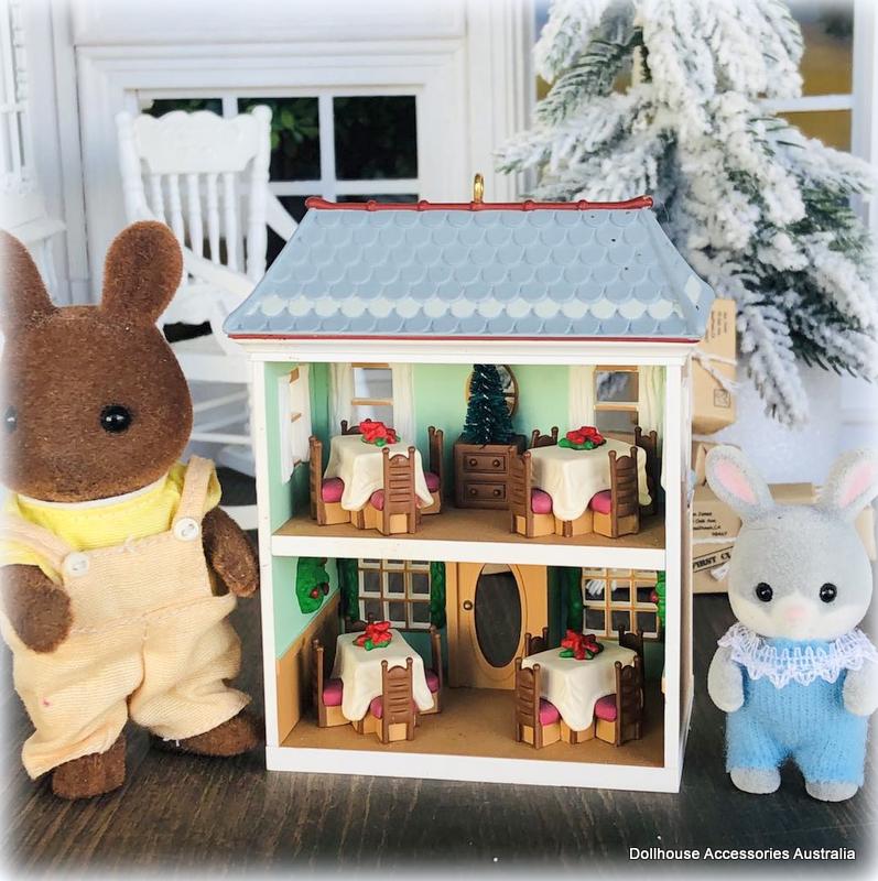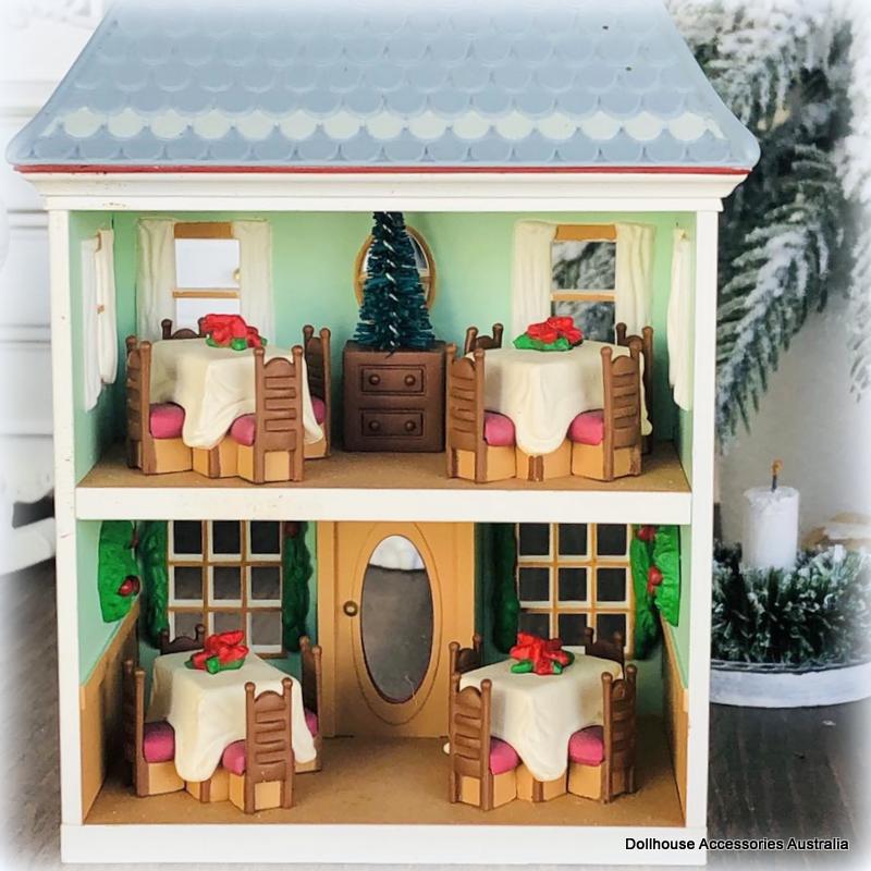 Fully furnished inside with miniature furniture which is about 1.5 cm high. Note that all mini furniture items are fixed and not intended to be removed. Doors do not open etc.