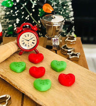 We can never have enough treats to place in a Miniature scene, can we? Here are some red and green, heart-shaped, Christmas-coloured tiny biscuits which would look great on a serving plate, in jars and bottles or place them in a tiny biscuit tin as a Christmas gift for a neighbour or teacher. These measure 0.7 cm diameter. It would be recommended to check the measurements of tin or jar to see if they will fit, if this is your intention.