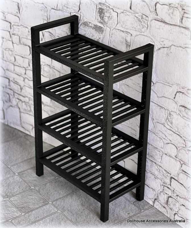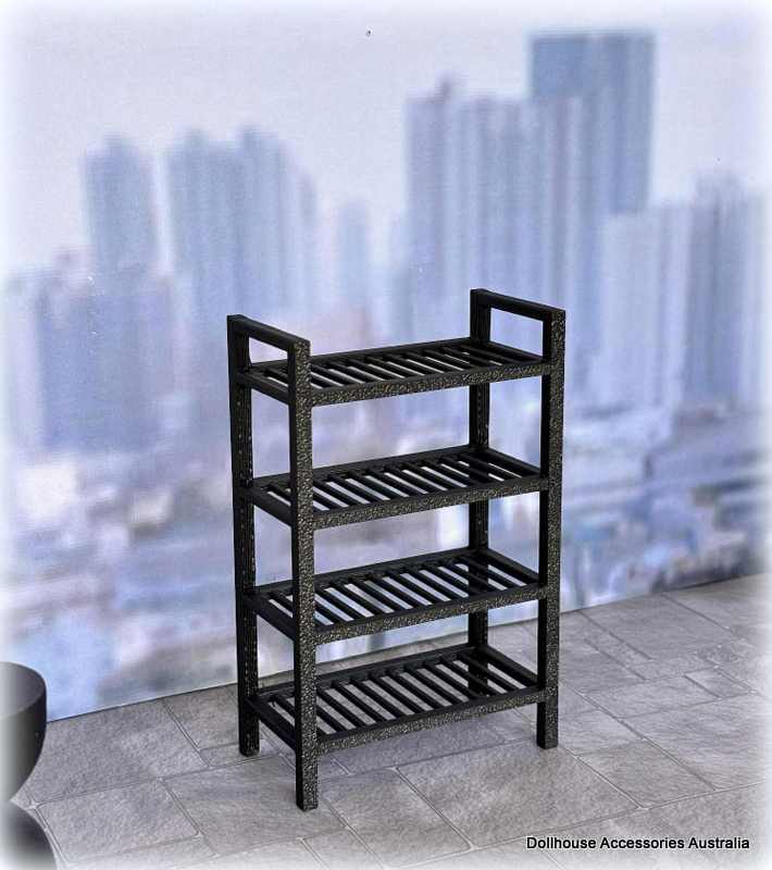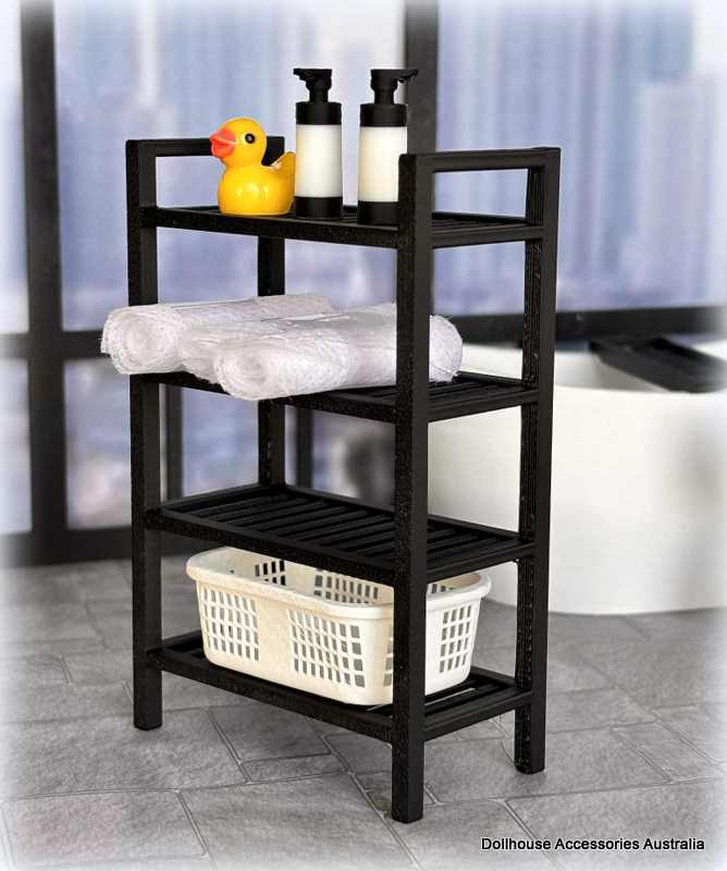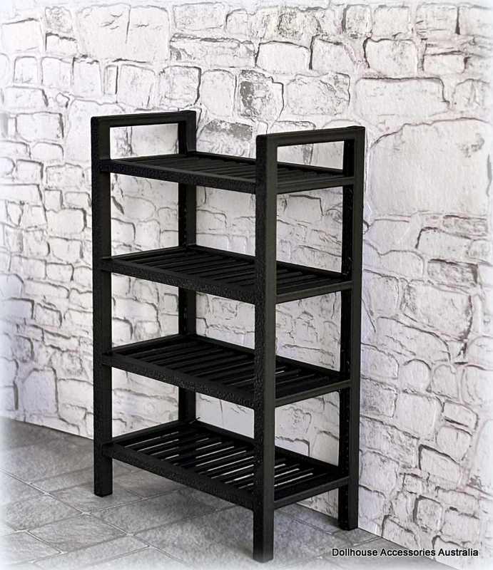 Dollhouse Miniature Storage Shelves - 4 Tiered - Black.  This is a dollhouse miniature accessory in 1:12 scale.