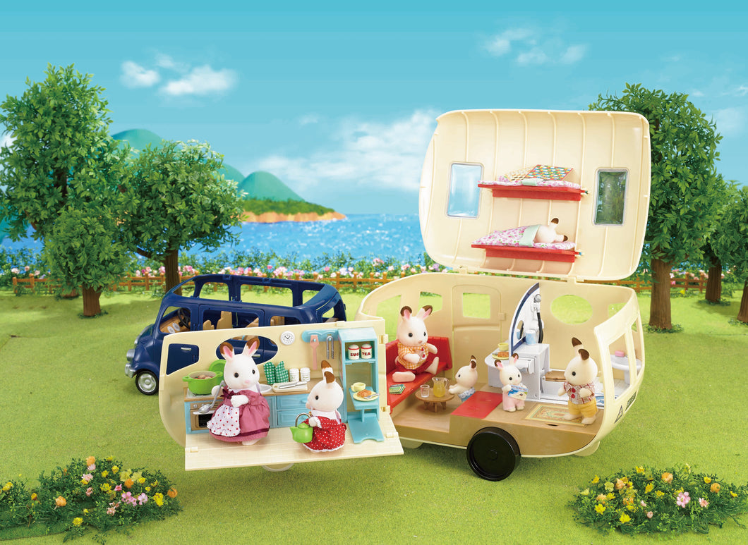 The Sylvanian Caravan has everything needed for staying away from home on a holiday! With over 30 accessories including sink, stove, drawers, cupboards and even a fold out ironing board, the caravan is ideal for those travelling holidays around Sylvania. The caravan can be towed by any Family Car which is sold separately.