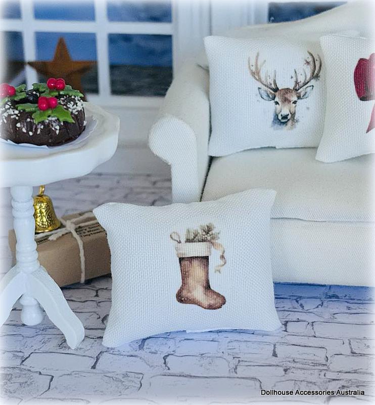 Dollhouse Miniature White Cushion - Gold Stocking theme - this is a 1:12 scale suitable dollhouse miniature accessory