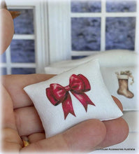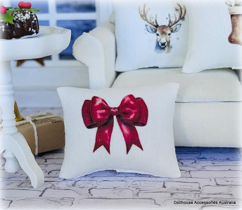 Dollhouse Miniature White Cushion - Red Bow theme - this is a 1:12 scale suitable dollhouse miniature accessory